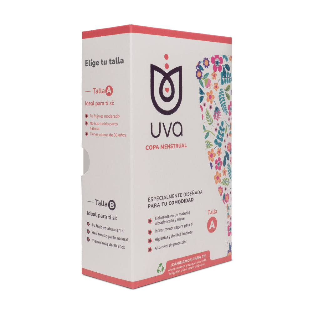 La Copa Menstrual UVA es un recipiente que se usa para retener el líquido menstrual. Es 100% segura con el cuerpo, suave y delicada para mayor comodidad, higiene y limpieza. A diferencia de los tampones y las toallas higiénicas, esta no absorbe, sino que retiene el líquido, permite que sea lavada y reutilizada hasta por un período de 10 años. La Copa Menstrual UVA está diseñada para que las mujeres se sientan tranquilas y libres; cambiará la forma en la cual viven su ciclo menstrual y podrán disfrutar de todas aquellas actividades y momentos del día sin ninguna molestia o preocupación. La Copa Menstrual UVA está fabricada con gel de sílice grado médico alemán, y disponible en dos tallas que son la A y la B. La talla A es la indicada para mujeres que no tienen hijos, su flujo menstrual es moderado y tienen menos de 30 años de edad; y la talla B es la correcta para mujeres que tienen flujo menstrual abundante, han tenido parto natural y tienen más de 30 años.