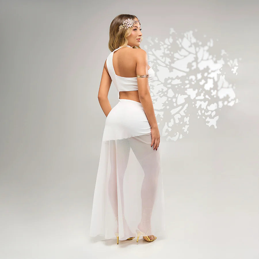 La falda de malla translúcida con abertura lateral y los aros metálicos crean un look celestial, mientras que el diseño asimétrico aporta un aire moderno y atrevido.