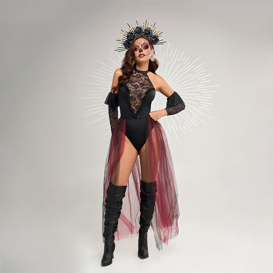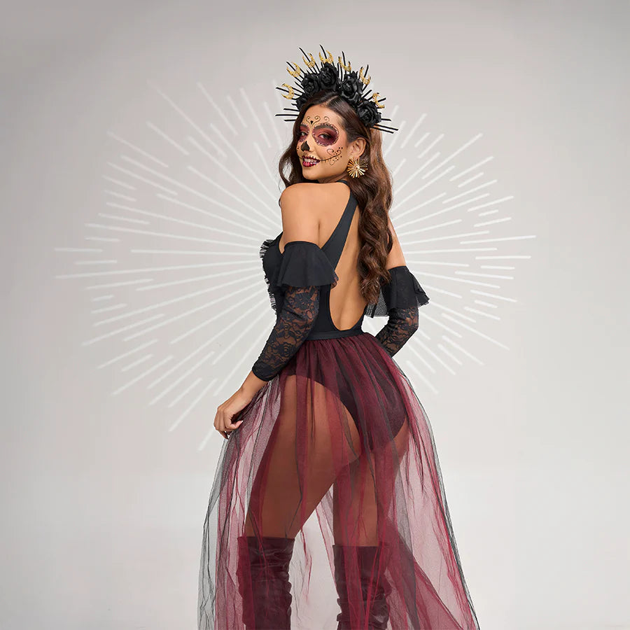 El tocado de rosas con detalles dorados se convierte en el accesorio estrella, ideal para brillar en cualquier fiesta temática o sorprender con un look impactante y lleno de carácter.o en la tradición del Día de los Muertos, este diseño combina sensualidad y elegancia gracias a su body