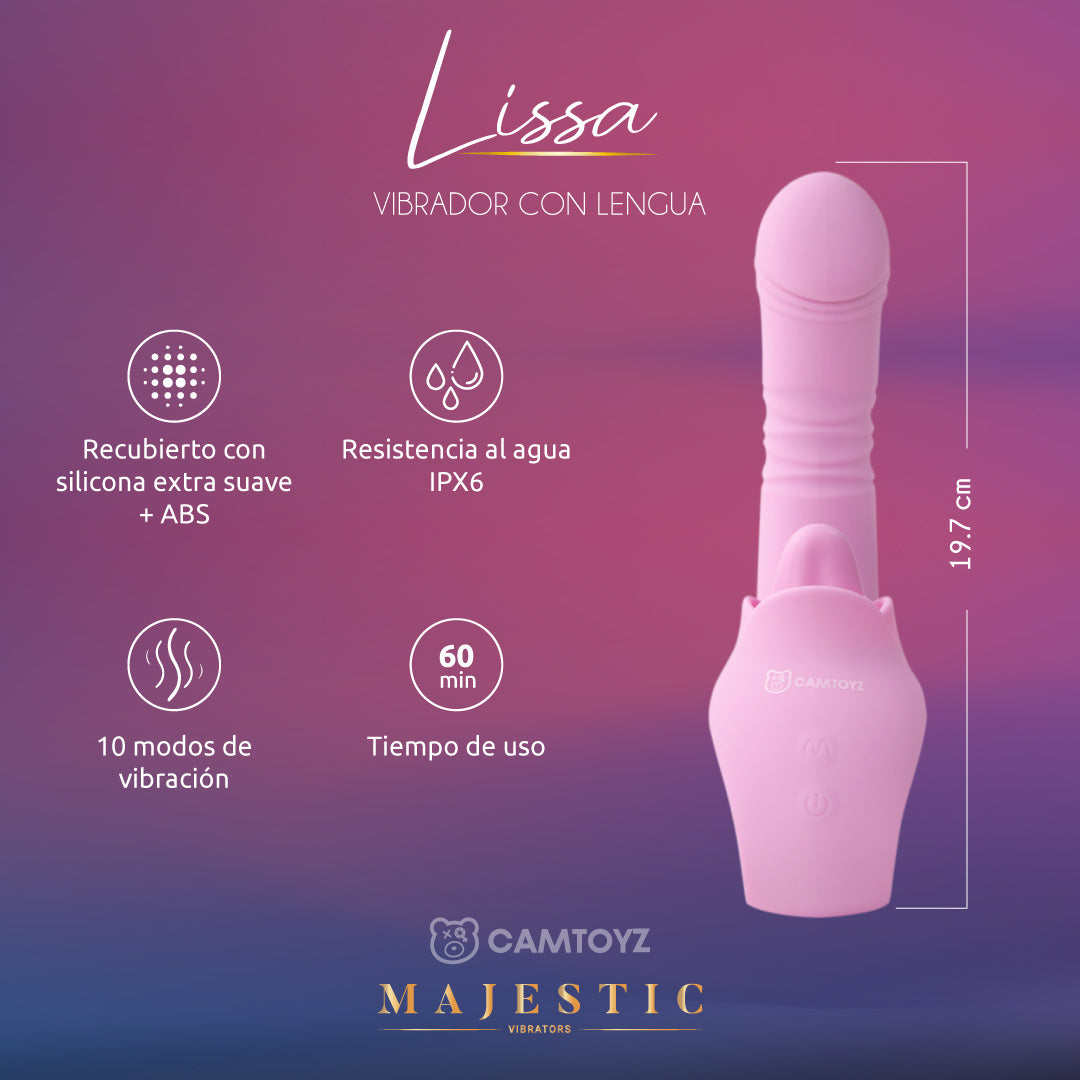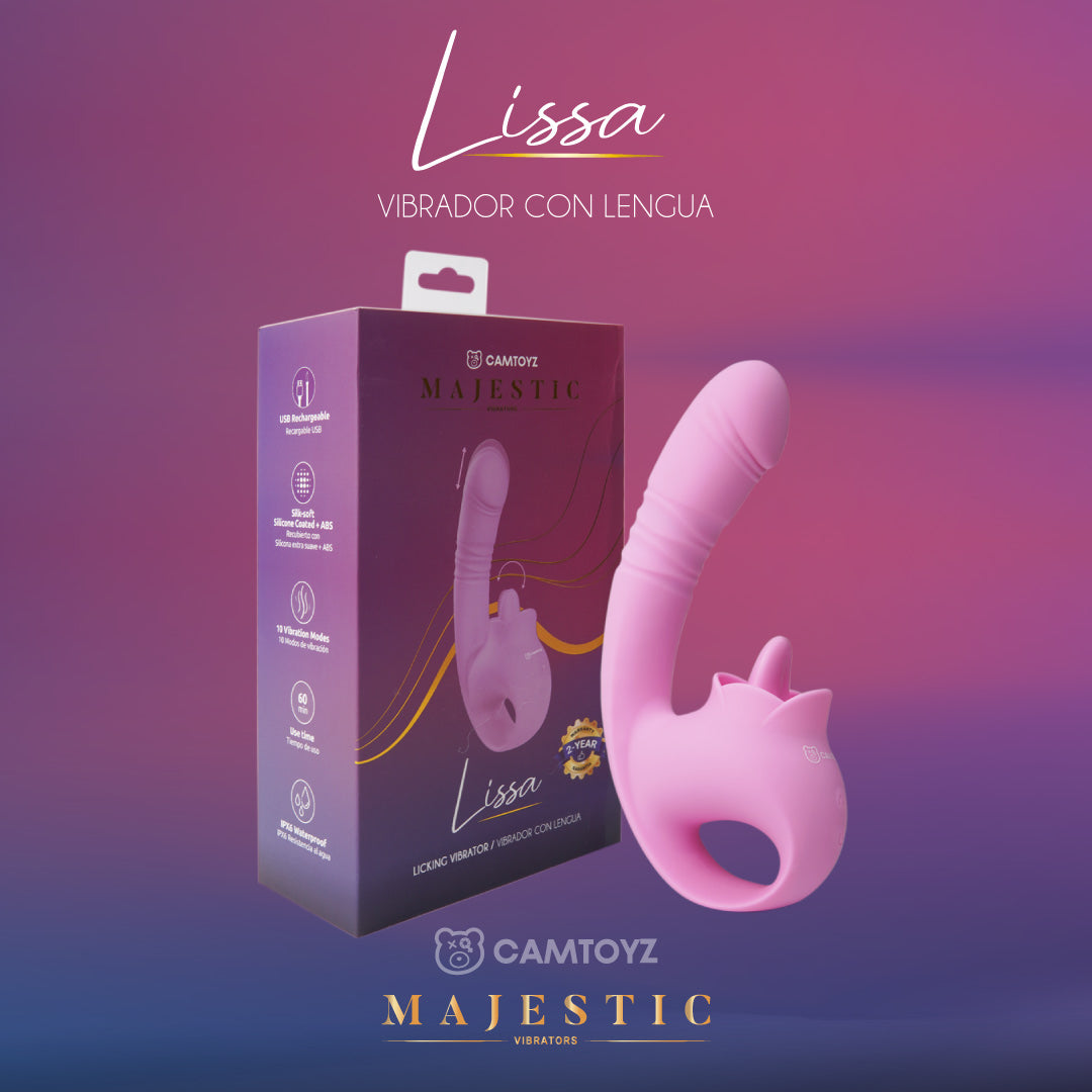 Eleva tu experiencia de placer con Lissa, el vibrador con lengua de la línea Majestic de CAMTOYZ que combina estimulación interna y externa en un solo dispositivo. Su diseño ergonómico y su avanzada tecnología te brindan sensaciones únicas, permitiéndote disfrutar el doble en cada uso.