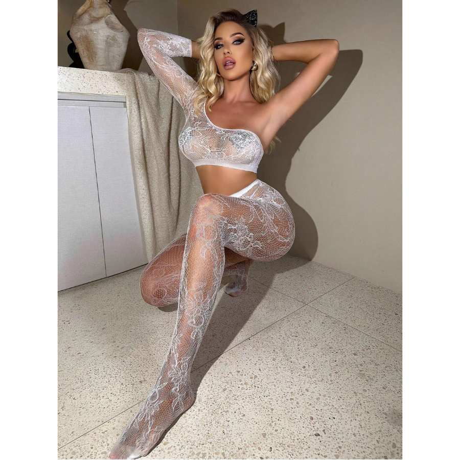 Deslumbra con esta malla de encaje blanco, diseñada para realzar tu figura con sutileza y sofisticación. Su tejido elástico y translúcido se adapta al cuerpo con suavidad, creando un efecto visual seductor sin perder la elegancia. Perfecta para momentos íntimos, sesiones fotográficas o sorprender con un look diferente.